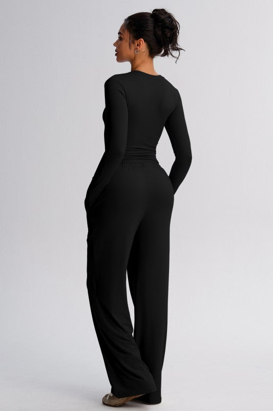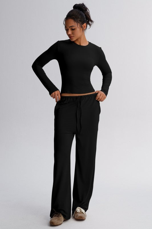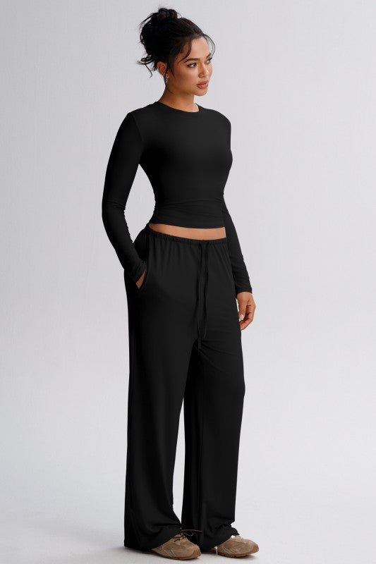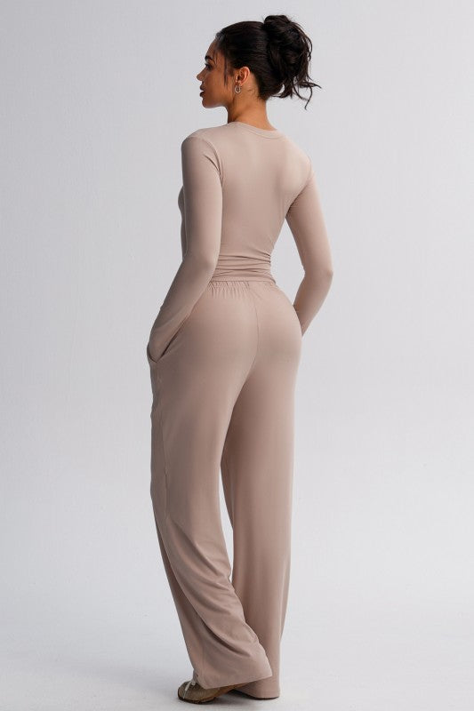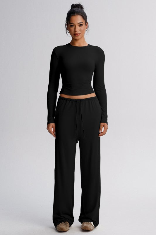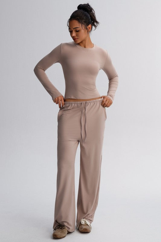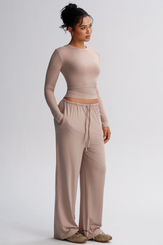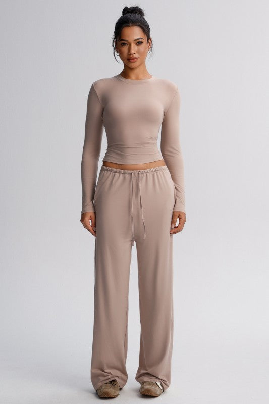 Quiet comfort with a clean, composed feel. Two-piece lounge set features a relaxed long-sleeve top for easy coverage, wide-leg pants for effortless wear, and a soft, wearable fabric designed for slow mornings and steady days.